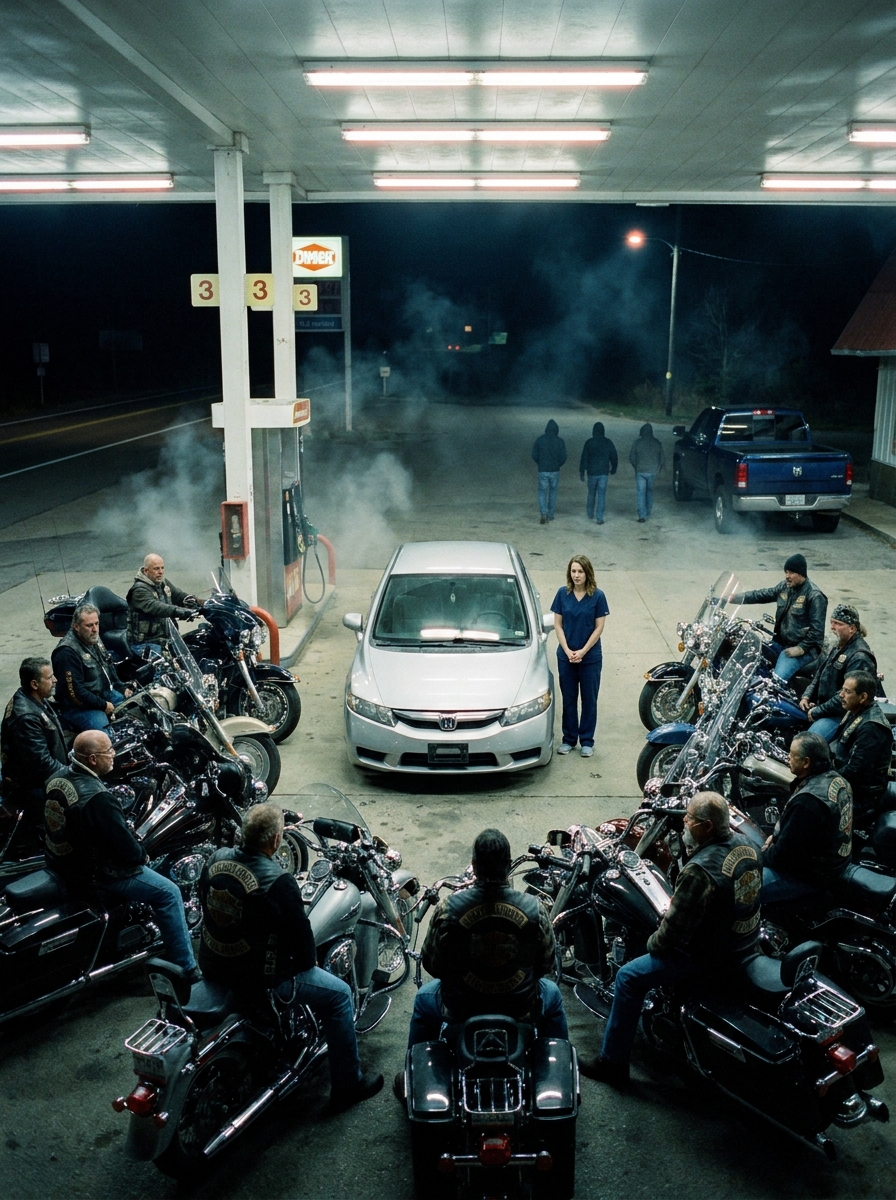 The bikes didn’t park in parking spaces. They formed a circle. A perfect, slow, deliberate circle around pump three — where my Honda Civic was — and the four men, and me.
