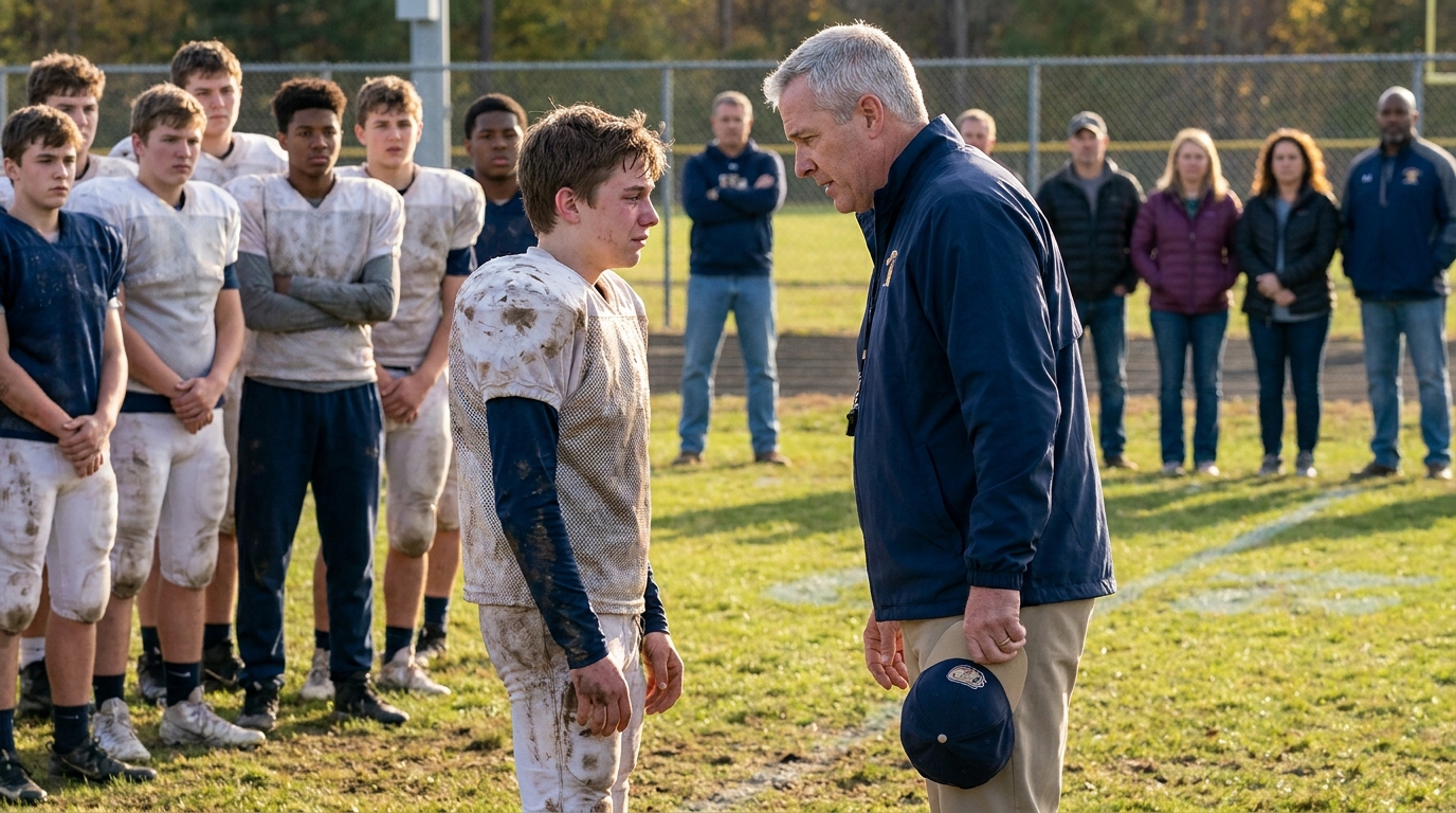 Coach Mercer stood at midfield with his cap in both hands, rain gathering on the brim, while Evan looked at him like he was waiting for the sentence to turn into punishment.