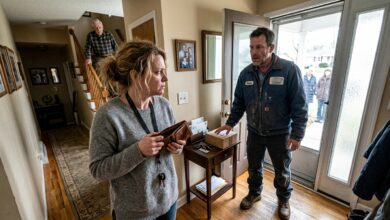 When the delivery driver bent beside the hallway table, slipped his rough hand near a leather wallet, and glanced once…