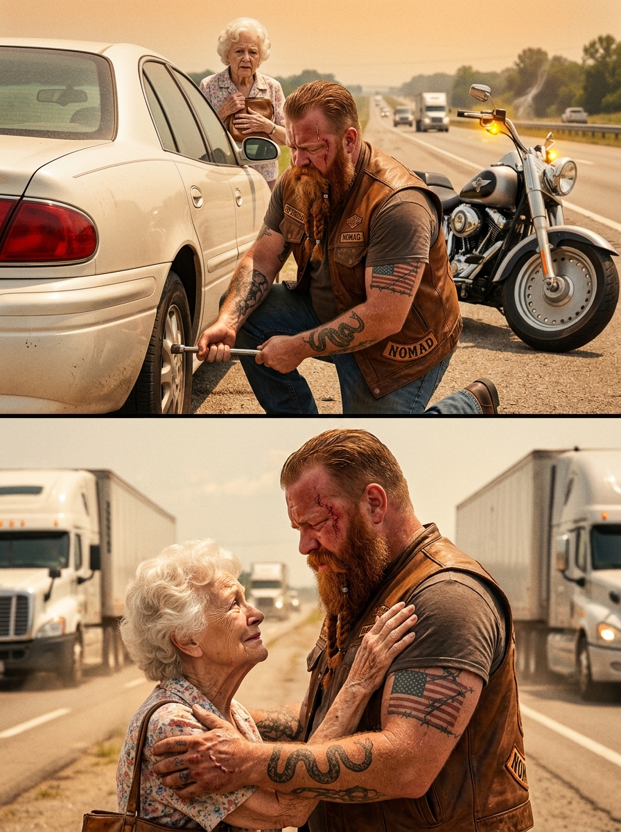 “Ma’am. I see your tire. I got a jack and a four-way in my saddlebag. You want help, I’m here. You don’t, I’ll wait with you till someone comes. Either way, you’re not sitting out here alone.”