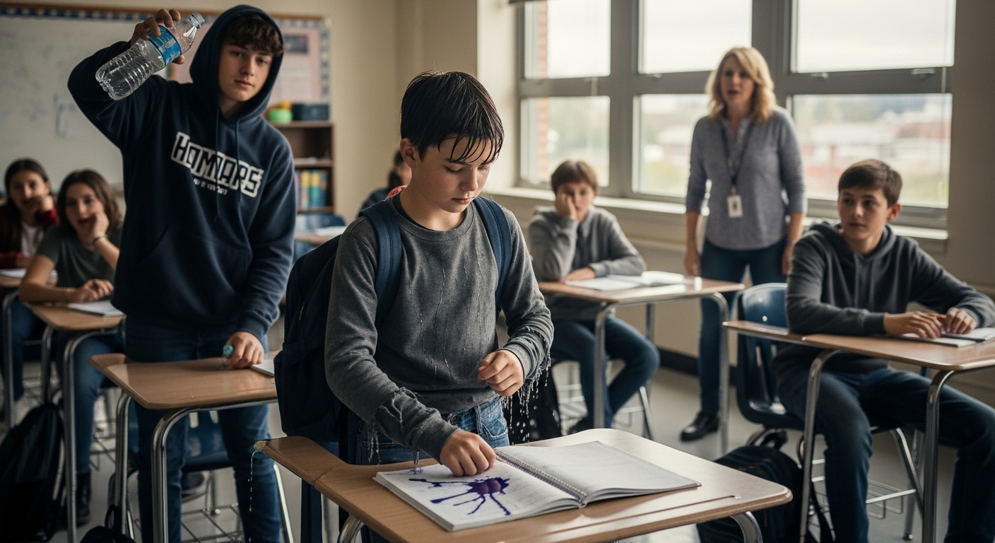 A plastic bottle, half full, tipped deliberately over his head in the middle of math class—clear liquid running down a faded gray sweatshirt that had already seen too many winters.