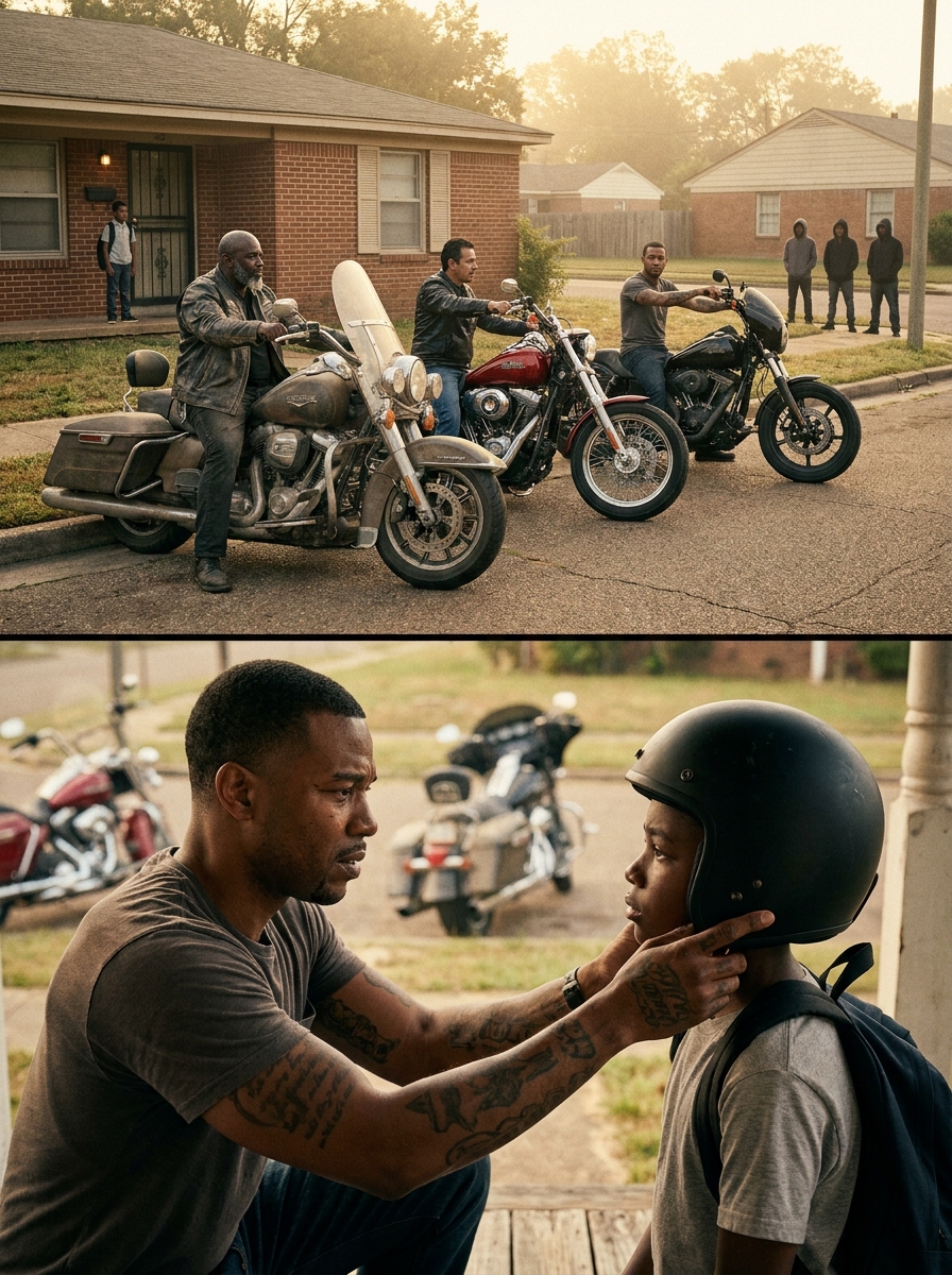 The escort ended because Malik didn’t need it anymore. Not because the gang was gone — the gang is still there, will always be there — but because Malik was a different kid. He had posture. He had a phone number of a biker who said 24/7. We come. He had three men he could call if anything slipped sideways.